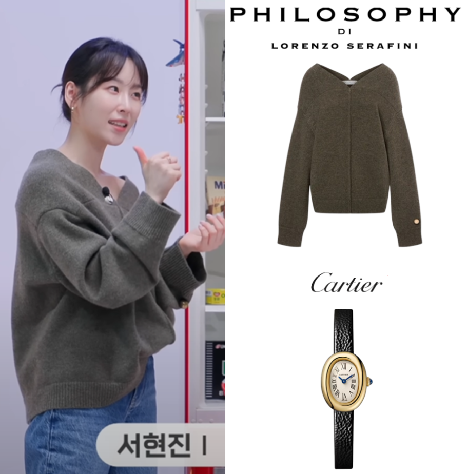 그녀의 오프숄더 니트는 이탈리아 브랜드 필로소피 디 로렌조 세라피니(Philosophy di Lorenzo Serafini) 제품으로 가격은 약 140만 원대이며, 시계는 고급스러운 까르띠에 베누아 워치(Cartier Baignoire Watch)로 약 1,000만 원대입니다.